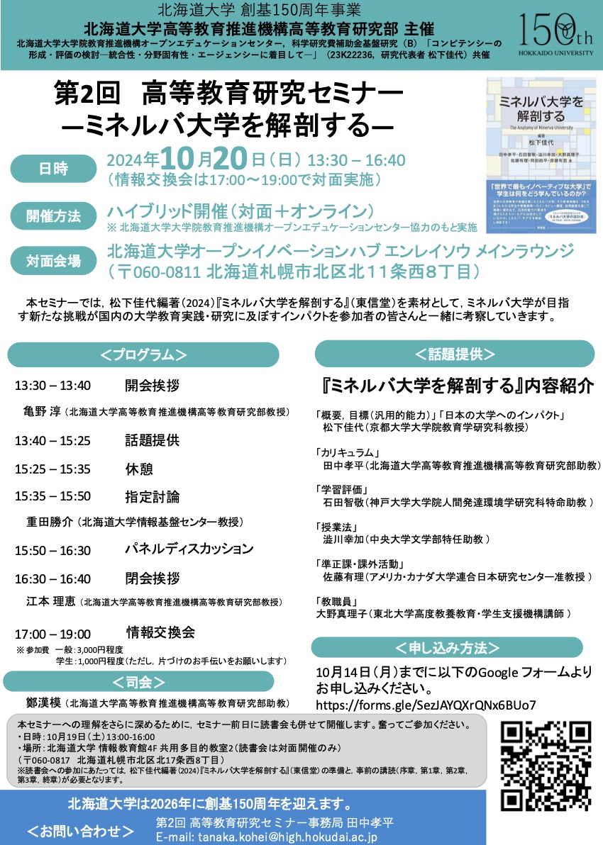 教員: 松下佳代(京都大学大学院教育学研究科教授)、田中孝平(北海道大学高等教育推進機構高等教育研究部助教)、石田智敬(神戸大学大学院人間発達環境学研究科特命助教)、澁川幸加(中央大学文学部特任助教)、佐藤有理(アメリカ・カナダ大学連合日本研究センター准教授)、大野真理子(東北大学高度教養教育・学生支援機構... 開講年:2024 タグ: 北海道大学創基150周年事業, 高等教育研究セミナー 講義投稿日:2025年4月21日